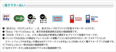 クロネコwebコレクト決済代行システムを採用しています。買い物カゴ内の確認画面にて、ご注文内容・ご入力内容をご確認のうえ、電子マネー払いをご選択ください。